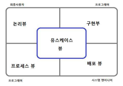 구성요소: 유스케이스 뷰 + 논리뷰, 프로세스뷰, 배포뷰, 구현뷰 (유논프배구)