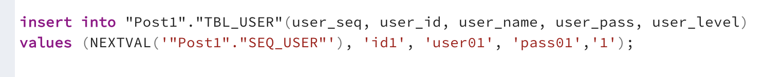 INSERT INTO "[스키마 명]"."[테이블 명]"([시퀀스 들어갈 컬럼 명], 컬럼 명, ...) VALUES ( NEXTVAL('"[스키마 명]"."시퀀스 명"').'[들어갈 값]', '들어갈 값', ...);